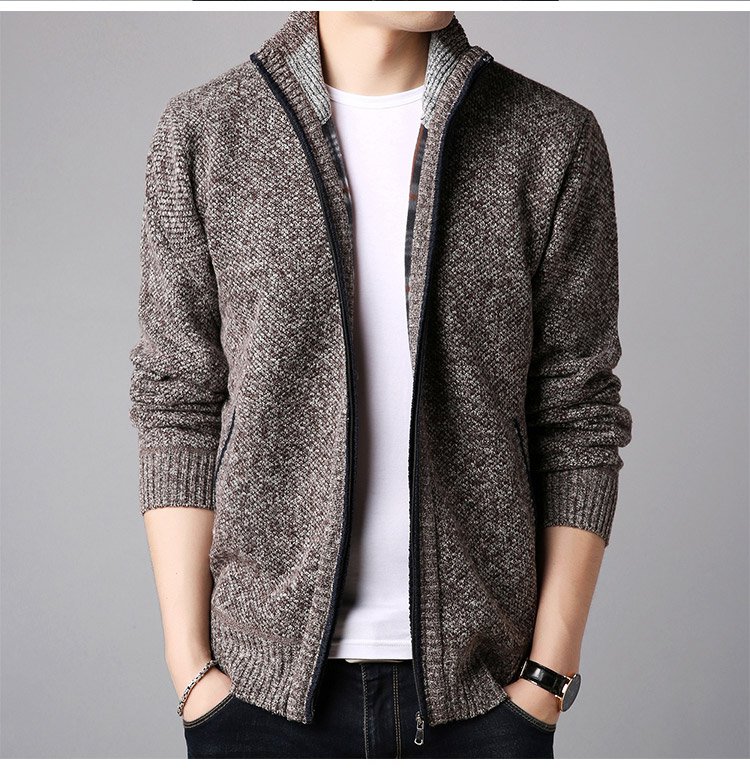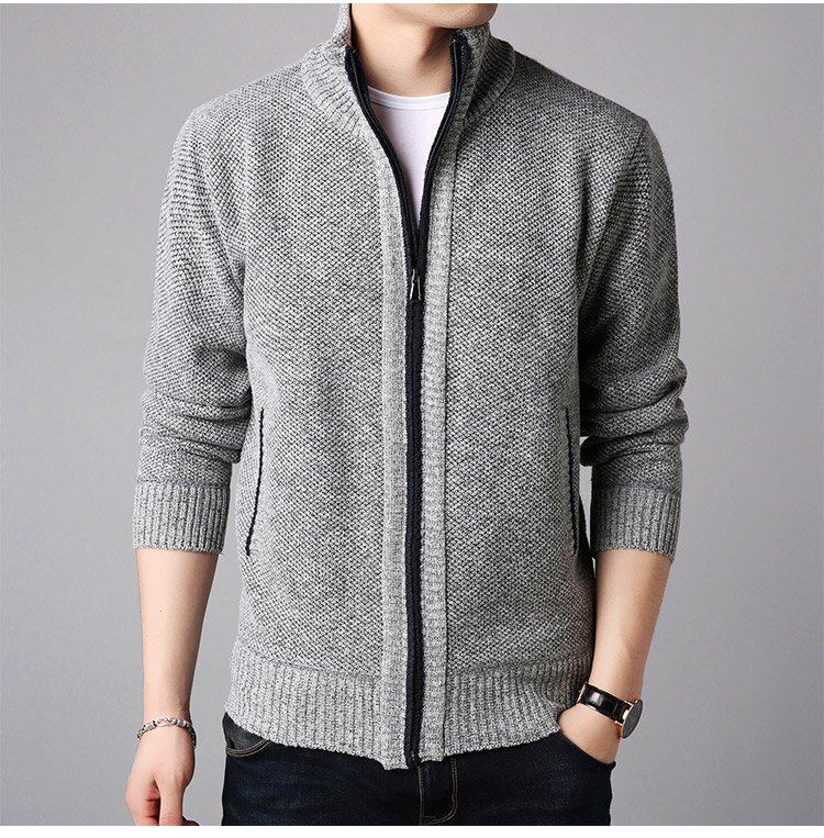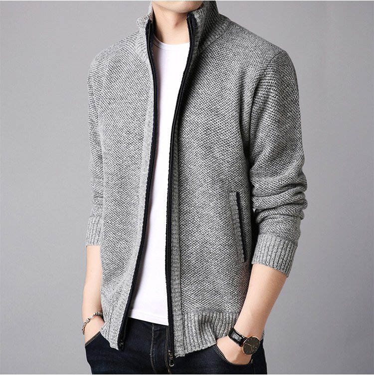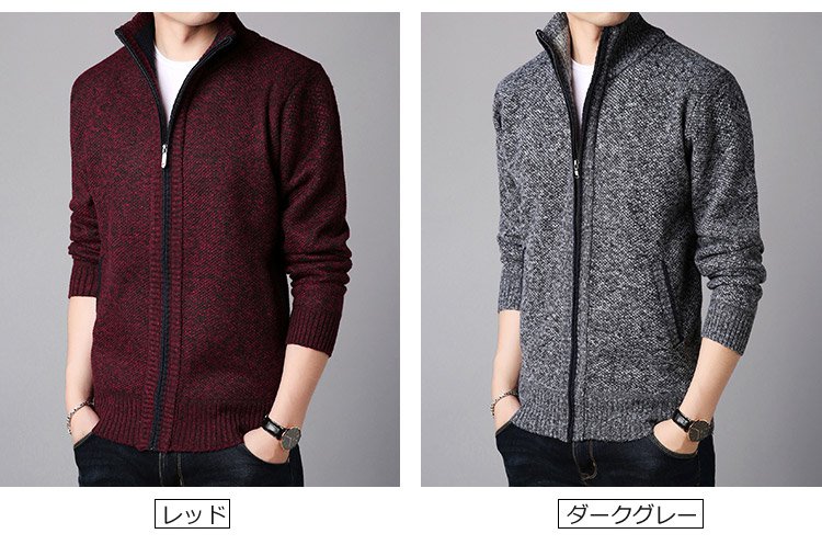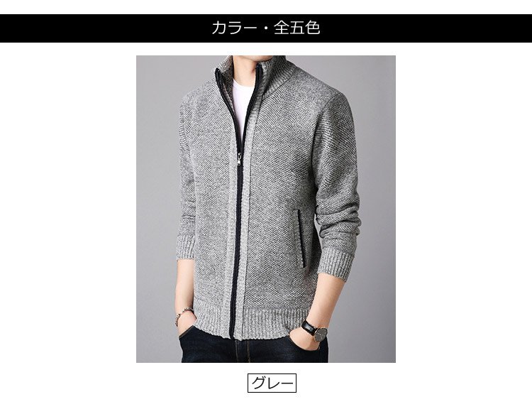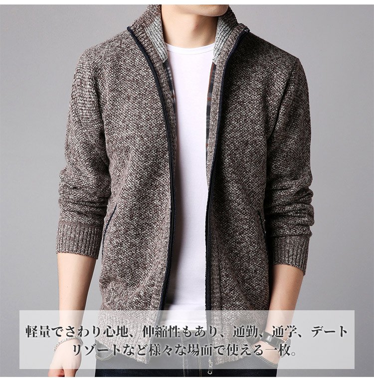 ジップアップ、ハイネック 暖かいメンズニットカーディガン 柔らかくて着心地も良い 無地なのでどんなボトムとも相性抜群